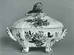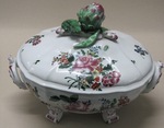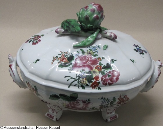 Ovale Deckeltterrine mit geschweifter Wandung, eingerollten Füßen sowie Artischocke und zwei Spargel als Knauf |