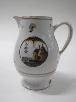 Milchkanne mit Haus und Baum in kreisrunden Medaillons und Streublumen |