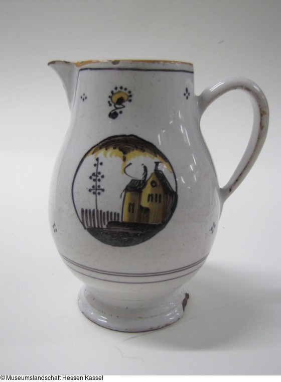 Milchkanne mit Haus und Baum in kreisrunden Medaillons und Streublumen