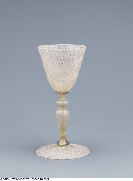 Das eleganteste Glas Europas, farbloses Kristallinglas, stammte aus Venedig. Die Techniken und Rezepturen zu seiner Herstellung unterlagen strengster Geheimhaltung. Das Kelchglas entstand durch Übereinanderstülpen zweier Glasblasen mit dünnen Fadenauflagen. Letztere bilden ein Netz, in das kleine Luftbläschen eingeschlossen sind.