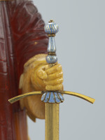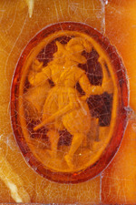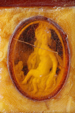Material / Technik: Bernstein, Knochenbernstein; Gold, teils emailliert; Messing, vergoldet