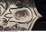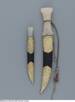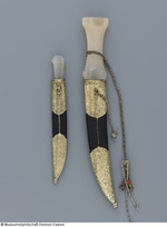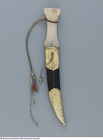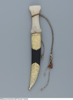 Klinge aus Wootz - Damaststahl (Wellendamast), zweischneidig, Spitze über die Rückenlinie hinaus nach oben gezogen. Angel 24 mm lang, im Griff mit Kitt befestigt. Einteiliger Griff aus Chalcedon, linsenförmiger Querschnitt, an der Handlage eingezogen, zehnkantig geschliffen, um den Griff eine geflochtene Handschnur aus schwarz korrodierten Metall- und hellen Seidefäden - Schnur ist gerissen - ein Ende mit teilt sich in drei abschließenden Schnüre, deren Enden Korallenperlen verzieren (an einem Ende fehlt die Korallenperle). Scheide aus Holzkern mit geprägtem, schwarz bemaltem Leder bezogen, die Fäden der versenkten Naht mit tordiertem Silberdraht umwickelt, Mundblech und Ortband aus Silber, vergoldet, graviert und punziert, mit Tremulierstrich versehen. Auf der Rückseite des Ortbands noch ungedeutete Tughra (gleicht der auf KP B II. 102). Trageöse aufgelötet, daran eine Kordel in Schlauchgeflecht, einzelne Garnstränge vermutlich aus Seide, umwickelt mit vermutlich Silberdraht. Kugelförmiger Abschluss der Scheidenspitze. (12.10.2012 AB, FHT) |