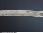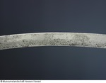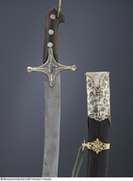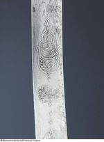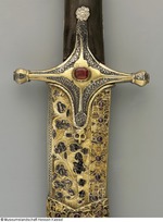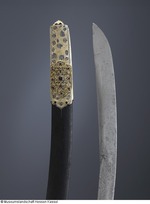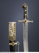 Damaststahl (Klinge aus Wootz FHT), (Dr. Augustin ist nach Besichtigung der Ansicht, die Klinge bestehe aus Schweißdamast), arabische Inschrift und Ornamente geätzt, auf der Rückseite zwei Kartuschen mit arabischer Inschrift. Vogelkopfgriffschalen (Karabellagriff) aus Horn, silberne Griffnieten (gegossen), silbernes Abdeckblech zwischen den Hornplatten. Parierstange gegossen, versilbert, vergoldet und graviert, mit Niello und gefasstem roten Glasstein. Scheide aus Holz, mit Lederbezug, silbervergoldete Beschläge, (teils gegossen, teils mit Zellenschmelzstegen. Es scheint als habe man Emaildekor vorbereitet, dann aber nicht ausgeführt), graviert, mit Niello, Besatz aus 24 Rubinen und einem Glasstein, ein Stein fehlt. Am unteren Ortblech ist auf der Rückseite die Nielleoverzierung abgeschabt (evtl. um eine dort befindliche Kartusche zu entfernen?). (12.10.2012 AB, FHT) an Scheide: geflochtene Trageschnur mit Quaste und Knebel aus kupfergrüner Seide; an Säbel: geflochtene Schnur mit Quaste aus goldfarbenen Metallfäden mit gelber Seidenseele |