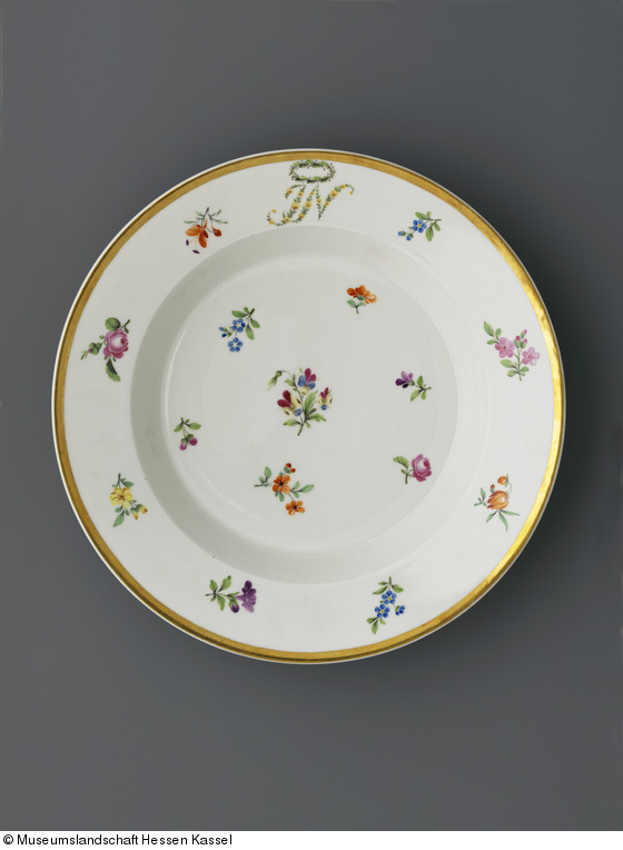 Teller aus einem Tafelservice König Jérômes mit bekrönten Initialen JN für "Jérôme Napoléon" und Streublumendekor |