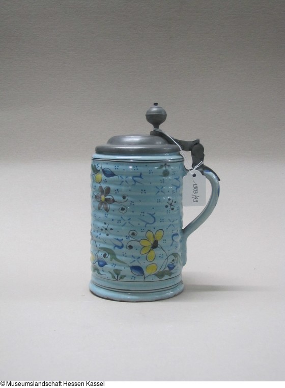 Fayence, glasiert und bemalt (Inglasur), Zinnmontierung |