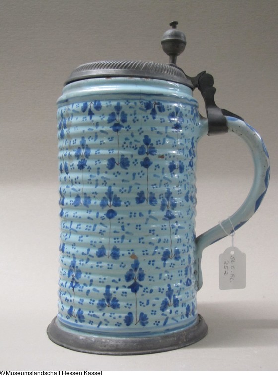 Fayence, glasiert und bemalt (Inglasur), Zinnmontierung |
