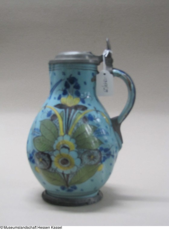Fayence, glasiert und bemalt (Inglasur), Zinnmontierung |