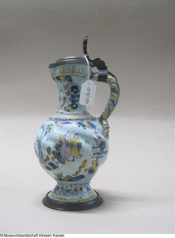 Fayence, glasiert und bemalt, Zinnmontierung |