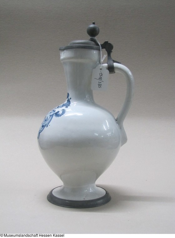 Fayence, glasiert und bemalt (Inglasur) , Zinnmontierung |