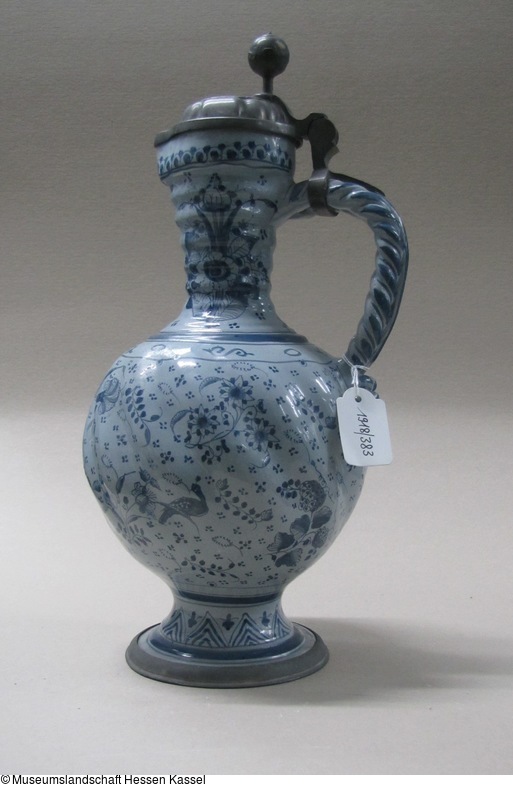 Fayence, glasiert und bemalt (Inglasur), Zinnmontierung |