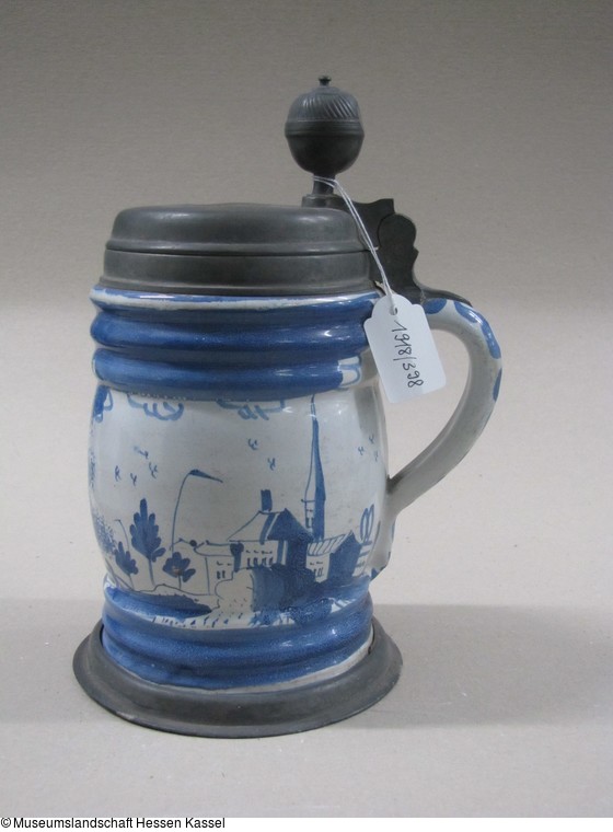 Fayence, glasiert und bemalt (Inglasur), Zinnmontierung |