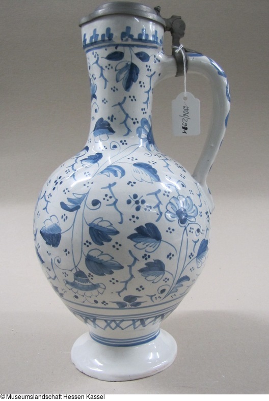 Fayence, glasiert und bemalt (Inglasur), Zinnmontierung |
