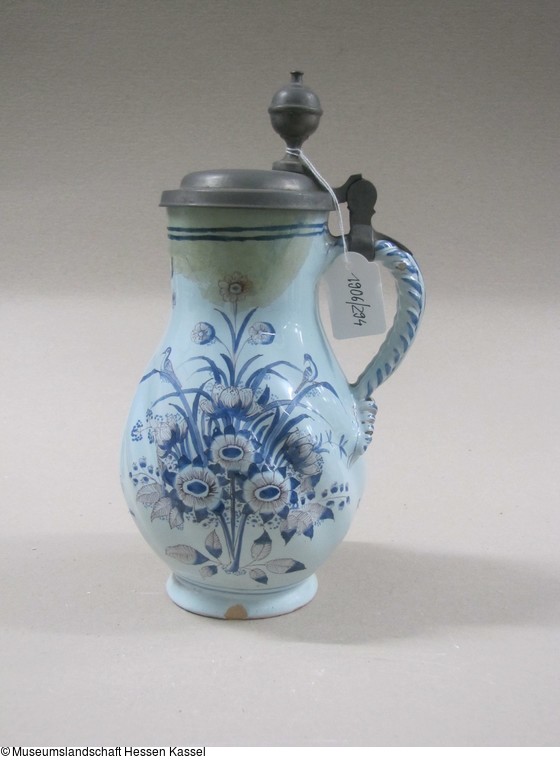 Fayence, glasiert und bemalt (Inglasur), Zinnmontierung |