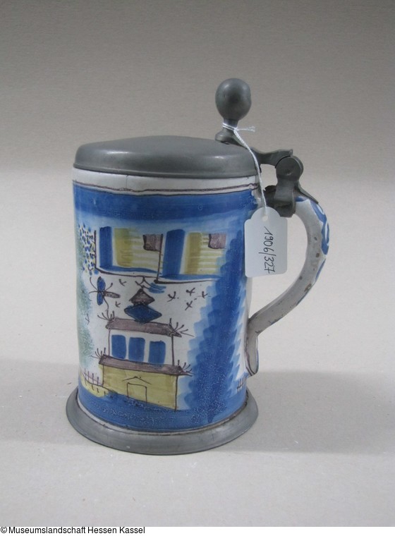 Fayence, glasiert und bemalt (Inglasur), Zinnmontierung |