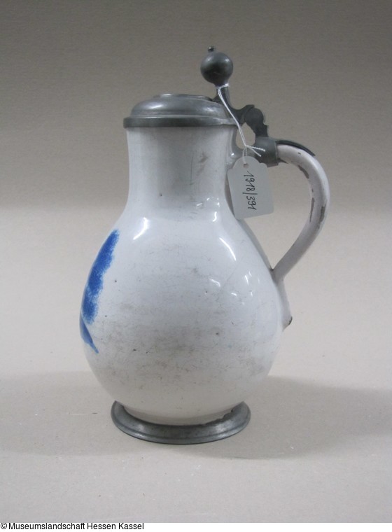 Fayence, glasiert und bemalt (Inglasur), Zinnmontierung |