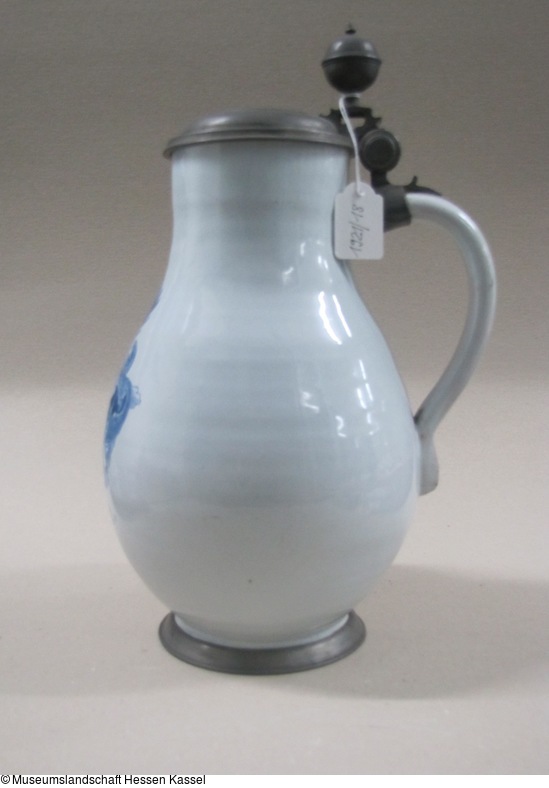 Fayence, glasiert und bemalt (Inglasur), Zinnmontierung |