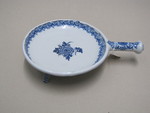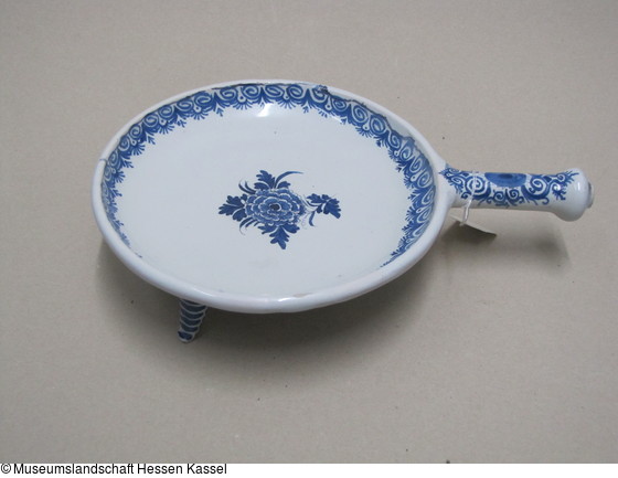 Pfännchen mit Griff und drei Beinen, dekoriert mit Blüte, Blättern und Doppelvoluten |