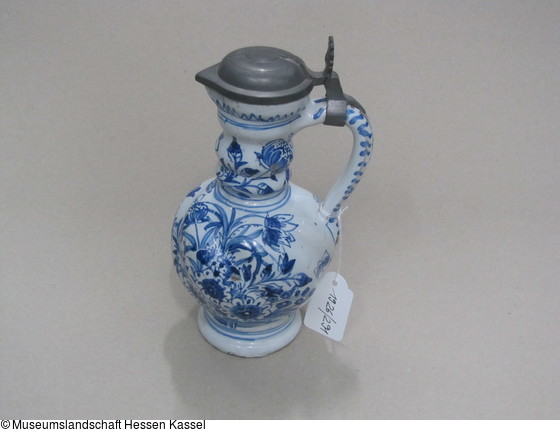 Fayence, glasiert und bemalt (Inglasur), Zinnemontierung |