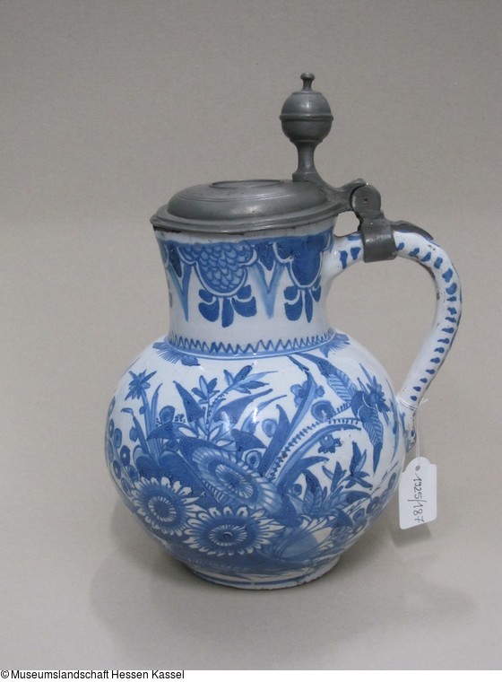 Fayence, glasiert und bemalt (Inglasur), Zinnmontierung |