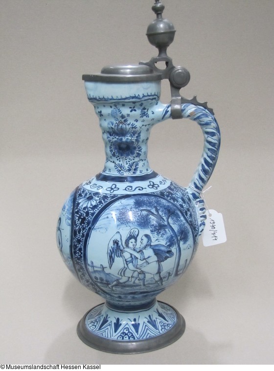 Enghalskrug mit biblischen Darstellungen und Zinnmontierung |