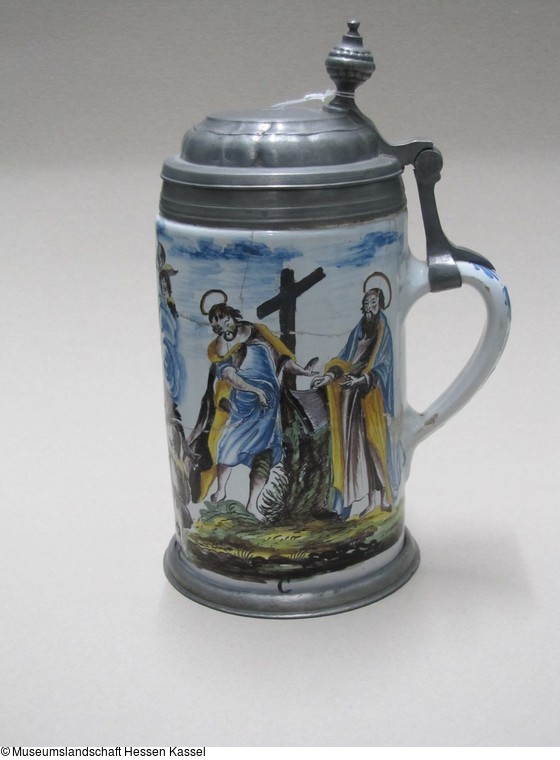 Walzenkrug in Zinnmontierung, darauf Johannes der Evangelist