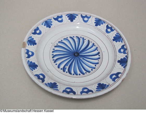 Teller mit Fächerrosette in Ringeinfassung im Spiegel sowie Palmetten und Schuppenmuster auf dem Rand |