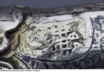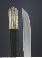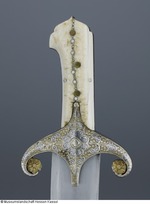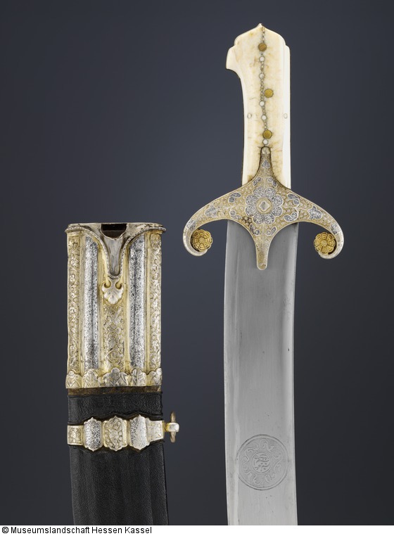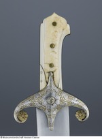 Säbel aus Damaststahl mit angesetzter Schneide, Inschrift geätzt. Vogelkopfgriff aus Walrosszahn. Stifte zum kaschieren des Zahnnervenkanals aus Elfenbein und Walrosszahn, Griffnieten aus Messing, vergoldet, Griffschalen an der Innenseite mit Horn belegt. Das Kupferband zwischen den Griffschalen ist graviert und vergoldet. Parierstange aus gegossenem Silber, teilweise vergoldet, Niello, punziert, graviert, in die nach unten gezogenen Enden eingelötete, gegossene und vergoldete Rosetten. Scheide mit Holzkern, dessen Oberfläche beidseitig fünf Halbrundstäbe ausbildet, mit Leder überzogen. Montierung aus Silber, teils vergoldet, teilweise graviert, Niello, mittlerer Tragebeschlag fehlt. Dekor teils mit stilisierten Tulpen (?). Auf der Schmalseite der Scheide (Seite des Klingenrückens) gut erkennbare Marke, derzeit noch nicht identifiziert. (05.11.2012 AB FHT) |