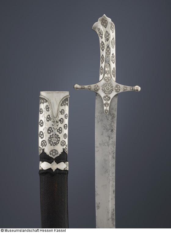 Klinge aus Stahl mit Spitze in der Rückenlinie, Verdacht auf Wootz - Damast (aufgrund des Gewichts und der hochwertigen Fassung). Kreuzförmige aus zwei Schalen gegossene und verlötete Parierstange aus einer Silberlegierung. Silberne Griffschalen in gleicher Technik, Ornamente gepunzt und in den Tiefen geschwärzt. Scheide aus Holzkern, schwarzes Leder, Beschläge aus einer Silberlegierung. Ornamente auf den Scheidenbeschlägen teils gepunzt, teils graviert, in den Tiefen teilweise geschwärzt. (31.10.2012 AB, FHT) |