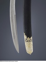 Säbelklinge aus Stahl (Verdacht auf Wootz), die Inschrift aus Silberdraht und goldfarbenem Metalldraht. Die beiden äußeren Niete der hölzernen Griffschalen bestehen aus Buntmetall (verm. Messing) die Innere aus einem weichen weißlichen Metall, an einer Seite ist der Nietkopf abgerissen, eine weitere Bohrung durch Griffschalen und Angel unterhalb des äußeren Nietkopfs ist ohne Inhalt (Vermutung: Befestigung der Handschnur). Auf die Kante der Angel war ein umlaufendes Blech mit Weichlot befestigt, welches aber heute verloren ist. Scheide mit Holzkern, Leder, Beschläge aus Silber, teilweise vergoldet, teilweise mit Nielloeinlagen. (05.11.2012 AB FHT) |
