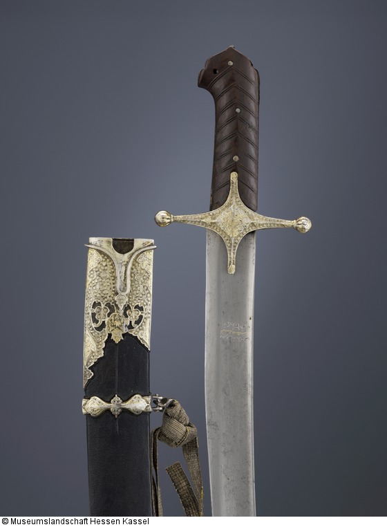 Säbel mit Holzgriff und reicher silberner, teils vergoldete Montierung, auf der Klinge eine arabische Inschrift