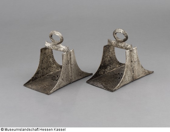 Eisen, im Ganzen gegossen, (laut Boeheim S. 213 arabischer Steigbügeltyp), mit rautenförmigen Gravuren (damit das Silber besser hält), dann mit Silber belegt und teilweise vergoldet (Reste auf der Unterseite). Seitenwangen gepunzt und graviert, in der Fußplatte eine mittige Bohrung zu der 12 schlüssellochartige Durchbrüche radial stehen. (07.11.2012 AB) |