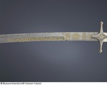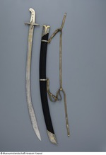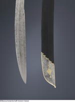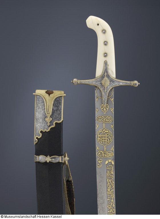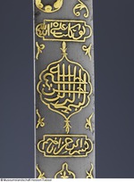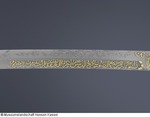 Säbel aus Wootz - Damast (nur in den dekorierten Partien zu sehen), Inschrift mit Goldtauschierung. Griff aus Walrosszahn mit einseitiger Knaufnase, Parierstange aus Silber gegossen, vergoldet, graviert mit sehr feinem Niello und punziert, Griffschalennieten: Silber, vergoldet, graviert mit Niello. (12.10.2012 AB FHT); Gehänge: gewebtes Band aus Metalldraht und gelber und blauer Seide, Beschläge mit Leder verstärkt. Schwerpunkt liegt fast auf der Klingenmitte. Sehr feine Arbeit in allen Details. Tragegurt: Bandgewebe, Breite 1,2 cm, Doppelgewebe, Leinwandabwandlung, Kettfäden: erste Lage: Metallfaden (vermutlich Seidenseele, umwickelt mit vergoldetem Metalllahn), zweite Lage: vermutlich Seide, blau und beige gefärbt. Schussfäden: gelbe Seide. |