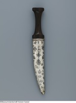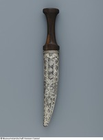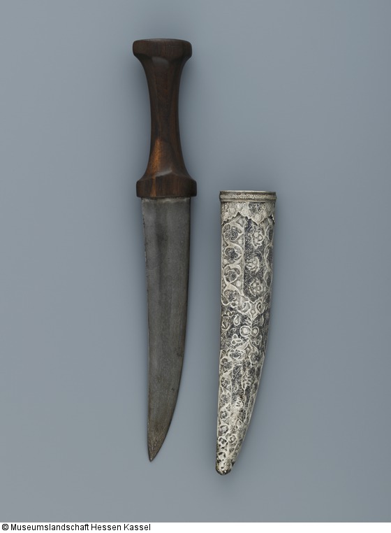 Die schlichte elegante Waffe mit dunklem Holzgriff und einer starken Klinge aus Wootzstahl dürfte im späten 17. Jahrhundert entstanden sein. Ihre vollständig mit nielliertem Silber beschlagene Scheide unterscheidet sie von den meisten anderen Dolchscheiden der Sammlung, die nur partiell mit Silberbeschlägen verziert sind. Dieser Umstand erlaubt es, sie mit einer Gruppe von Dolchen in Verbindung zu bringen, die 1727 im Gewölbe unter dem Neuen Kabinett und somit im Besitz Landgraf Karls nachzuweisen sind (siehe auch KP B XVII.23). (15.10.12 AS)