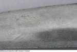 Klinge aus Wootz - Damaststahl, dekorlos, auffällig starke Klinge. (30.10.2012 FHT) Einschaliger Griff aus Holz (Palisander), zehnkantig geschliffen (Kanten durch Gebrauch? stark abgerundet), im Querschnitt oben und unten linsenförmig. Scheide aus Holzkern, komplett mit Silberblech bezogen, einst aufgenageltes (heute aufgeklebtes) Mundblech aus Silber, graviert und punziert, mit Niello. Auf der Rückseite eine aufgelötete Öse. (12.10.2012 AB) |