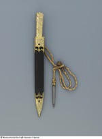 Messer und Scheide scheinen ursprünglich nicht zusammen zu gehören, da sich beide im Dekor deutlich unterscheiden. Eine Besonderheit ist der kleine Wetzstahl, der an einer Kordel an der Scheide hängt und zum Nachschärfen des Messers diente. (15.10.12 AS)