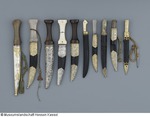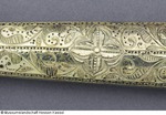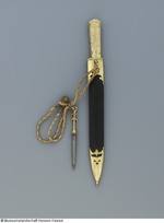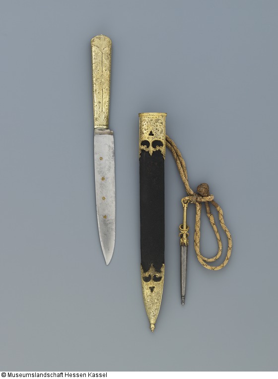 Einschneidige, an der Klingenspitze zweischneidige Klinge aus Damaststahl, (ob Schmiede- oder Wootzdamast vorliegt, ist wegen der Überarbeitung nicht sicher; vermutlich eher Wootz), mit vier eingeschlagenen Messingnieten verziert, die auf einer Seite sternförmig sind. Angel mit aufgelötetem Silberblech. (30.10.2012 FHT) Griff aus Silberblech, vergoldet, punziert und graviert, Holraum verfüllt, an der Austrittstelle der Angel dekoratives Ornament. Scheide aus Holzkern mit schwarzem Leder bezogen, Beschläge aus Buntmetall, vergoldet, punziert (nur an der Vorderseite) und graviert. An der Rückseite Öse mit Scharnier, angelötet, daran Kordel mit Wetzstahl in vergoldeter Buntmetallfassung. Drei vergoldete Ringe unbekannter Funktion spielen lose um den Griff. (12.10.2012 AB) |