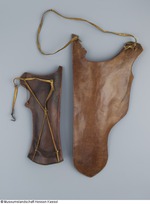 Die beiden ledernen Köcher sind mit rotem Samt bezogen und mit einem gestickten Nelkenmuster aus Silberdraht und vergoldetem Silberdraht verziert. In dem größeren Köcher wurde der gespannte Bogen aufbewahrt, während der kleinere Köcher für den Transport der Pfeile diente. Aus diesem Grund verfügt er auch über einen eingesetzten Holzboden. (15.10.12 MZ)