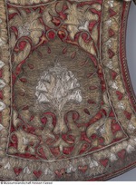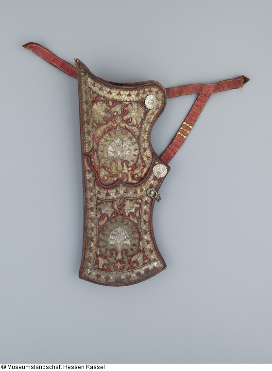 Körper aus Leder, bezogen mit rotem Seidensamt, der mit Gold- und Silberdraht bestickt ist, der Gurt ist mit einer roten Brettchenborte besetzt. weitere verwendte Materilialien:Holz; Messing |