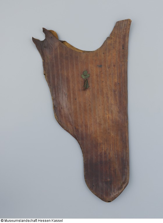 Die aus einem Stück gefertigte Lederhülle diente einst als Schutz für einen aufwendig verzierten Bogenköcher. Den Inventaren zufolge gehörte er zu Beginn des 18. Jahrhunderts zum Bogenköcher der Garnitur KP B XVII.350/1, 351/1. Später wurde er aber auch für den Bogenköcher der Garnitur KP B XVII.353/1, 357/1 genutzt. Dies war nur möglich, weil beide Bogenköcher über dieselben Maße verfügen – vielleicht ein Hinweis auf deren Fertigung innerhalb einer Werkstatt. Die Erhaltung dieser Schutzhüllen ist äußerst selten, obwohl sie vermutlich in vielen Sammlungen wie zum Beispiel in Dresden einst existierten. (15.10.12 MZ)