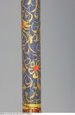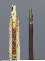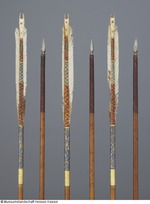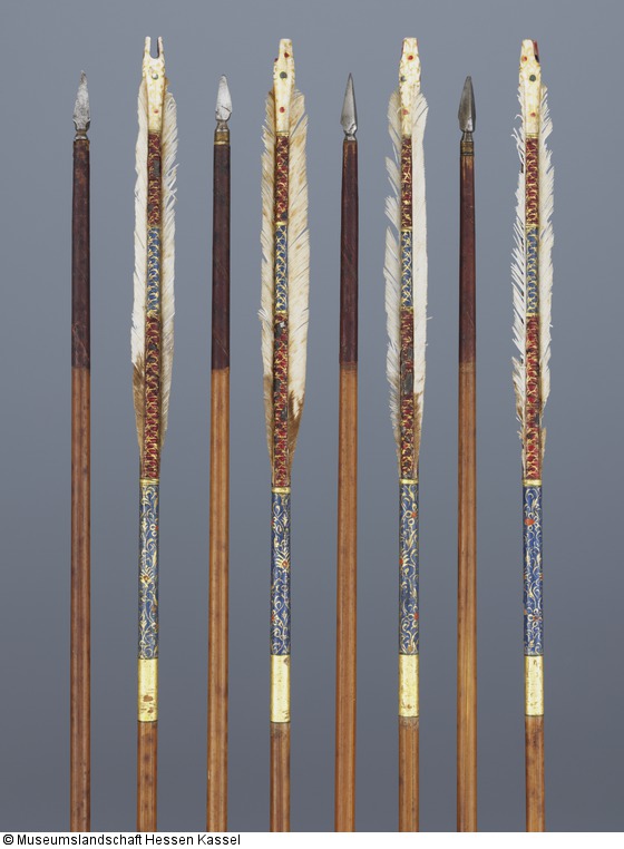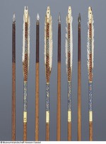 Pfeile sind schon seit dem 18. Jahrhundert in den Inventaren der Kasseler Sammlung nachweisbar, aber werden in keinem Fall genauer beschrieben. Diese aus Zedernholz gefertigten Pfeile zeichnen sich neben einem reichen Blumen- und Rankendekor auch durch geschnitzte und bemalte Kerbstücke aus Bein aus. Die Bemalung imitiert eine Golddrahtauflage mit gefassten Edelsteinen und ist in dieser Sammlung singulär. (15.10.12 MZ)