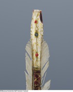 Pfeilschaft aus Zedernholz (?); Farbfelder in Rot und Blau mit Silberdraht, mit floralen und geometrischen Motiven in Gold bemalt. Nocke aus Bein, mit Rot, Blau und Gold bemalt. Weiße Befiederung. (05.11.12 AB) |