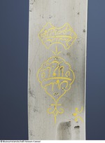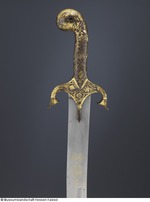 Klinge wahrscheinlich aus Damaststahl, wegen starker Überarbeitungen nicht sicher erkennbar, Tauschierung aus Gold, im Bereich der Schärfe mehrere Beschädigungen durch Hiebe, Schärfe wenig nachgeschliffen. Griffschalen und Parierstange werden durch zwei miteinander hart verlötete Halbschalen aus Eisen gebildet (keine Niete zur Befestigung an der Angel sichtbar), der Dekor ist graviert und gepunzt, die Oberfläche ist brüniert und vergoldet. Den Bereich der Fehlschärfe fassen zwei dünne Eisenbleche, die wohl wiederum mit den Halbschaleninnenseiten verlötet sind, die Verbindung der Bleche mit der Klinge erfolgt durch zwei eiserne Niete, der Hohlraum ist mit einer weißen, wachsartigen und nicht untersuchten Masse verfüllt. Im Knauf ein Loch für die verlorene Handschnur. Arbeitsschritte: 1. Vernieten der Bleche mit der Klinge, 2. Verlöten der Bleche mit den Halbschalen, 3. Verlöten der Halbschalen, 4. Verfüllen des Hohlraumes. (05.11.2012 AB FHT |