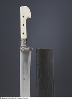 Gemarkte Klinge aus Schmiededamast (Türkischer Damast), aus vier Torsionsbahnen und angeschmiedeter, nicht damaszierter Stahlschneide. Rückenbahn Z - förmiger Damast (Sachse,Manfred: Damaszener Stahl, 2008, S.179). Griff aus nielliertem und graviertem Silberblech, am Übergang Klinge/Angel weich mit Klinge verlötet. Abdeckblech zwischen Griffschalen aus Buntmetall mit 0,5 mm starker und niellierter Silberplattierung. Griffschalen aus innerer Buntmetallplatte und äußerer Griffschale aus Elfenbein, mit drei Eisennieten mit der Angel verbunden. Scheide aus zweiteiligem Holzkern, schwarzer Lederbezug mit Naht auf dem Klingenrücken, Außenseite geprägt. Eine Fehlstelle mit braunem Leder ergänzt. Mundblech unter dem Leder aus Buntmetall mit Wickelfalznaht auf der Körperseite. Zwei Löcher auf Klingenrücken (zur Aufnahme heute fehlender Trageösen?). (05.11.2012 AB FHT) |