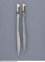 Klinge aus Stahl, leicht verbogen. Griffschalen je zweilagig aus einer dünnen, innen angebrachten Horn-Platte und einer äußeren Elfenbein-Griffschale. Befestigung mit der Angel durch drei Eisenniete. Am Übergang Klinge/Angel Zierblech aus Buntmetall, das mit der Klinge weich verlötet ist. Der Raum zwischen Griffschalen und Angel ist verfüllt mit gewachstem Textil, auf der Ober- und Hinterseite wird er durch ein Buntmetallblech mit Punzverzierungen abgedeckt. Arbeit insgesamt etwas nachlässig ausgeführt. Scheide aus zweiteiligem Holzkern, Lederbezug mit Naht auf der Körperseite. Trageöse aus Holz, ein Eisenniet auf der Außenseite mit unbekannter Funktion. (31.10.2012 AB FHT) |