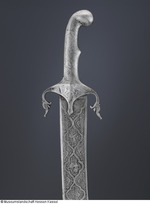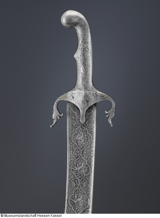Der Säbel ist NT 68 sehr ähnlich. Klinge und Griff aus Stahl mit Ätzdekor, auf dem Griff schlechter erhalten (durch Gebrauch?). Der Klingenrücken zieht im mittleren Teil stark ein, hier sind Spuren sichtbar, die auf Schweißdamast hindeuten könnten. Oberflächentauschierung aus feinem Silberdraht. Der zweischalige Griff aus Eisen ist mit Buntmetall verlötet, die Parierstangen massiv gearbeitet. Die Gestaltung des Griffs ist NT 59 ähnlich, beide bieten auffällig wenig Seitenführung. Es fehlt eine Bohrung für die Handschnur. (31.10.2012 AB, FHT) |