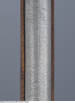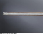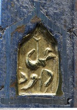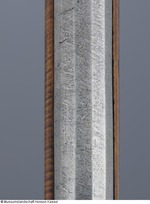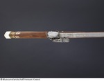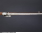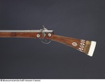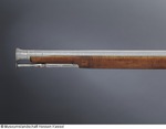 Lauf aus Eisen mit Mantel aus ca. 1 mm starkem Schweißdamast. Bohrung ohne Züge. Kammerstück und vorderer Lauf rund, mit leichtem Mittelgrat, dazwischen zwölfeckiger, gemarkter Laufteil. Die Mündung leicht ausgestellt mit aufgesetztem Silberkorn. Laufboden mit Kielbogen und Visierloch. Tauschierungen aus silberfarbenem Metall. Schnapphahnschloß aus Eisen, wangenseitig mit zwei Schlitzschrauben befestigt, Hahn mit Sperrvorrichtung, geriffelte Schlagfläche, Abzug und Abzugbügel aus Eisen. Räumnadeln und Gehäuse fehlen. Zwei rechteckige Trageösen auf der Wangenseite (möglicherweise europäisch). Ladestock aus Holz, Eisentüllen mit Ausdreher und Stopfer (02.11.2012 FHT). Schaft aus Holz, Kolbenabschluss aus Elfenbein, mit zwei Holzdübeln am Schaft befestigt. Zwei schmale Bänder aus grün eingefärbtem Horn mit einem Musterstreifen aus Elfenbein und Ebenholz (?) fassten ein verloren gegangenes Dekorband ein (an den Kleberresten ist das Muster ablesbar). Seitlich am Kolben und an der Unterseite des Schaftes eingesetztes Perlmutt, in das ornamental rote und schwarze Pasten eingelegt sind. Einfassungen der seitlichen Schlossschrauben ebenfalls aus Perlmutt, blütenartig gestaltet. Langes eingesetztes Elfenbeinplättchen hinter dem Abzugsbügel, dessen Rand ornamental eingekerbt, die Fläche mit Kreuzschraffur (mit schwarzer Paste ausgelegt) verziert (07.11.2012 AB) |