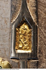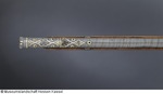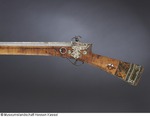 Schaft aus Holz, Beschläge aus Buntmetall hinter dem Laufboden und an der Ladestockbohrung teilversilbert und nielliert. Am Kolben eingelegte Bänder und Ornamente aus Schildpatt, Elfenbein, grünem Horn, Perlmutt und roter Paste. Bleche durch Buntmetallnägel mit halbrunden und sternförmig ausgearbeiteten Köpfen befestigt. Viele Teile fehlen, das Muster ist an den Kleberresten zu erkennen. Kappe auf dem Kolbenabschluss fehlt. (07.11.2012 AB) |