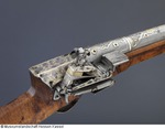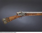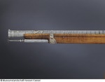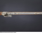 Lauf aus Eisen mit Mantel aus Schweißdamast in ca. 12 mm breiten Streifen. Bohrung ohne Züge. Kammerstück und vorderer Lauf rund, dazwischen ein zwölfeckiger, gemarkter Teil. Vorderer Laufteil mit Grat. Mündung leicht ausgestellt, mit Korn aus zwei parallel aufgelöteten Metallstreifen. Laufboden mit Kielbogen und Visierloch. Reiche Silbertauschierungen und -plattierungen mit Fehlstellen. Viele von den gefassten grünen Steinen fehlen. Schnapphahnschloss aus Eisen, wangenseitig durch zwei Schlitzschrauben befestigt, Hahn mit Sperrvorrichtung und Fingerbügel, obere Klemmplatte mit versilbertem und nielliertem Buntmetall plattiert. Geriffelte Schlagfläche, Abzug und Abzugsbügel aus Eisen, Studel mit graviertem Silberblech plattiert. Räumnadeln und Gehäuse fehlen. Zwei runde Trageösen in Polyederköpfen aus Eisen auf der Wangenseite, auf der Schlossseite fehlen die Zierscheiben. Ladestock aus Holz, beidseitig Eisentüllen mit Schraubkappen, zweiteiliger Stopfer mit Lotnaht längs und gefeilter (falscher) Tordierung. (31.10.2012 FHT)