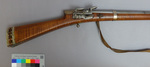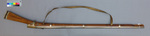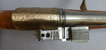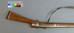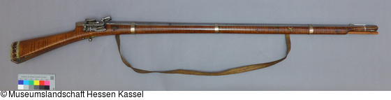 Lauf aus Eisen, sehr schlank und schlicht, Bohrung ohne Züge. Längsriefen zeigen Gebrauch an. Zwei Querwülste auf dem Lauf, einer am Kammerboden, der andere im ersten Drittel des Laufs. Gerade auslaufende Mündung, mit aufgelötetem Korn aus Buntmetall, die Kimme fehlt gänzlich. Vor dem Abzug fixiert eine Schlitzschraube mit grün gefärbter Hornunterlage den Laufboden. Drei Blechstreifen aus Buntmetall umfassen Lauf und Schaft, auf den beiden vorderen ist ein schmaler, auf dem hinteren ein breiterer Mittelgrat eingearbeitet. Das vorderste Blech ist 28 mm zu weit hinten montiert. Schnapphahnschloss aus Eisen, wangenseitig durch zwei Schlitzschrauben mit grün gefärbten Hornunterlagen befestigt. Letztere sind mit niellierten Nägeln aus Buntmetall befestigt, wie auch die der Laufbodenverschraubung. Gravierter Studel mit tauschiertem und gemarktem Buntmetallscheibchen. Hahn mit Sperrvorrichtung, die obere Klemmplatte und die Klemmschraube fehlen. Geriffelte Schlagfläche, Abzug aus Eisen mit kugeligem Abschluß. Räumnadel und Gehäuse fehlen. Lederriemen schlossseitig verknotet, wangenseitig aus dem Schaft austretend. Abdeckblech hinter dem Laufboden aus graviertem Buntmetall mit Buntmetallnägeln befestigt, Reparaturen mit Eisennägeln. Ladestock aus Holz, an einem Ende mit Eisenblechtülle, in der ein Gewindeloch den heute fehlenden Ausdreher anzeigt. Das andere Stockende ohne gesondert angesetzten Stopfer. Der schlichte Lauf stammt vermutlich von einer europäischen Beutewaffe. (01.11.2012 FHT)