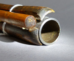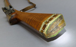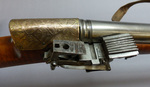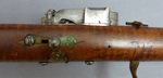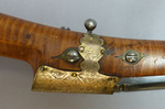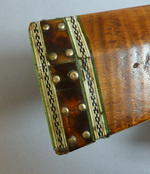 Der Kolbenabschluß fehlt. Fragmentarisch erhalten hat sich ein Zierband in der Abfolge schmaler Streifen grün eingefärbten Horns, zwei schmale Streifen Elfenbein, ein dreilagiges, in sich vesetztes Muster aus Elfenbein und Ebenholz (?), zwei schmale Streifen Elfenbein, ein breiter Streifen Schildpatt, aufgeklebt und mit Buntmetall-Rundkopfnägeln befestigt, dann wiederholt sich das Horn- und Elfenbeinmuster. (07.11.2012 AB) |